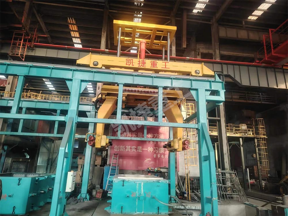 機(jī)械手用于完成造型最后階段的鑄型的起模及翻箱合箱,該設(shè)備適用自動(dòng)化生產(chǎn)線及對(duì)鑄型起模精度及合箱精度較高要求的生產(chǎn)線,可有效降低工人勞動(dòng)強(qiáng)度,降低行車?yán)寐?。機(jī)械手各參數(shù)根據(jù)用戶生產(chǎn)率及砂箱尺寸進(jìn)行非標(biāo)確定